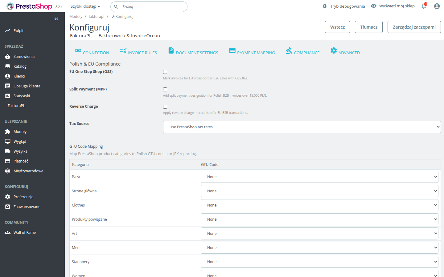 All settings in this guide are found under Modules โ Module Manager โ Fakturownia Pro โ Configure โ Compliance tab.