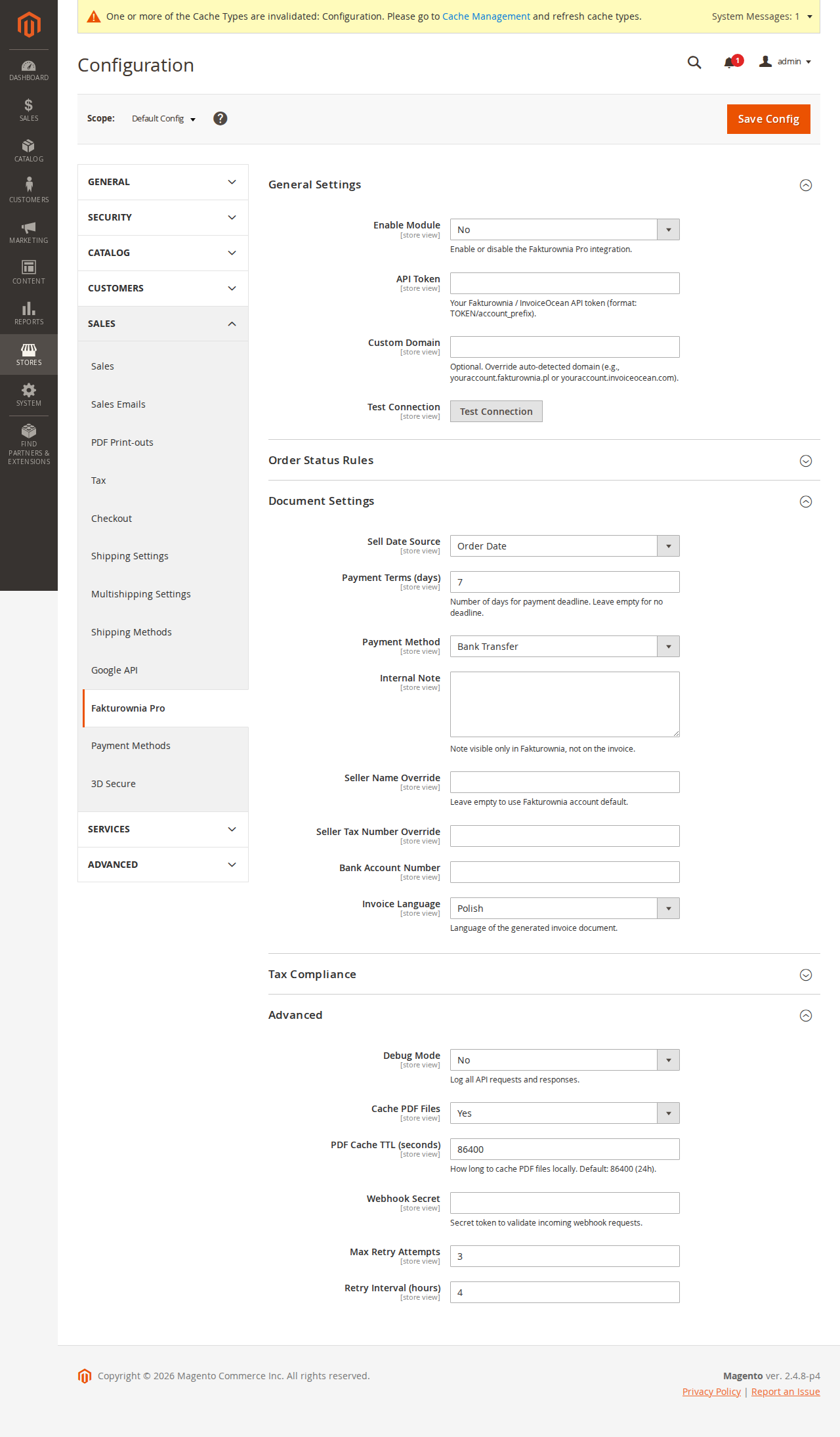 Overrides are sent as seller_name, seller_tax_no, etc. in the Fakturownia API payload. They do not modify your Fakturownia account settings โ€” they apply only to invoices generated by this Magento instance.