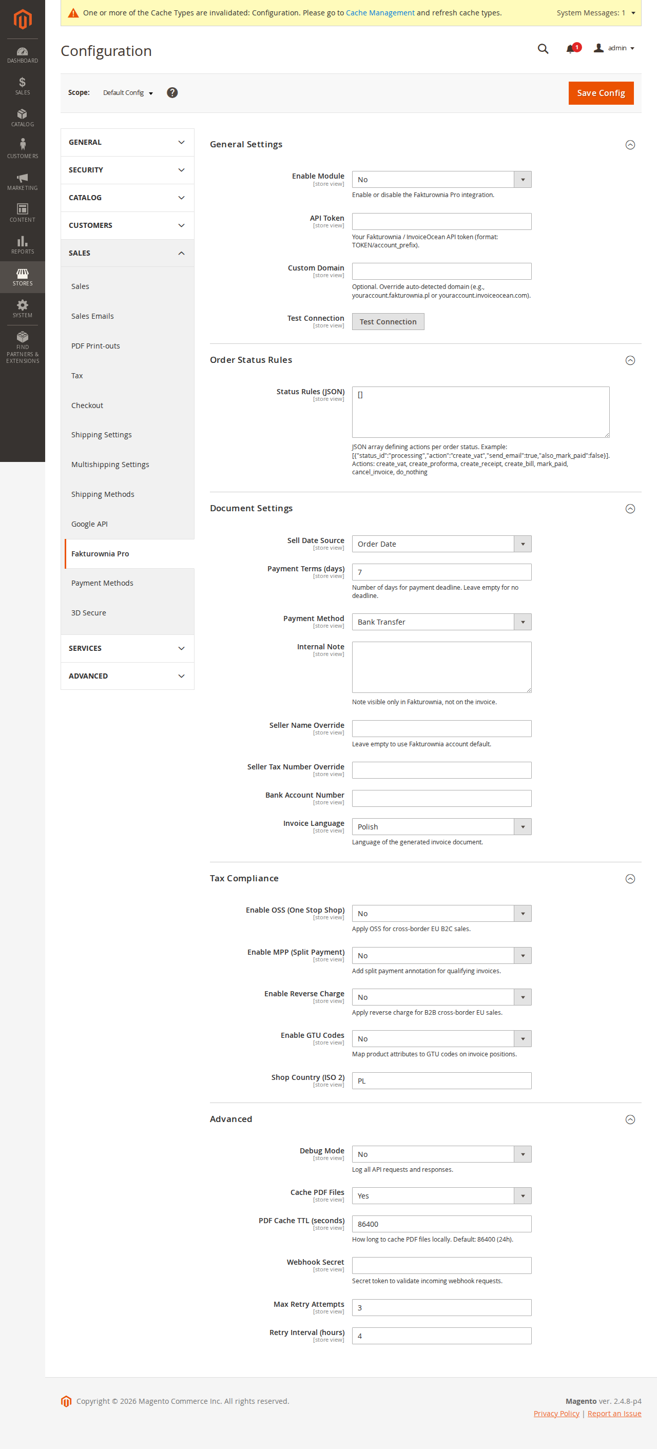 Magento's configuration scopes apply fully to all Fakturownia Pro settings: