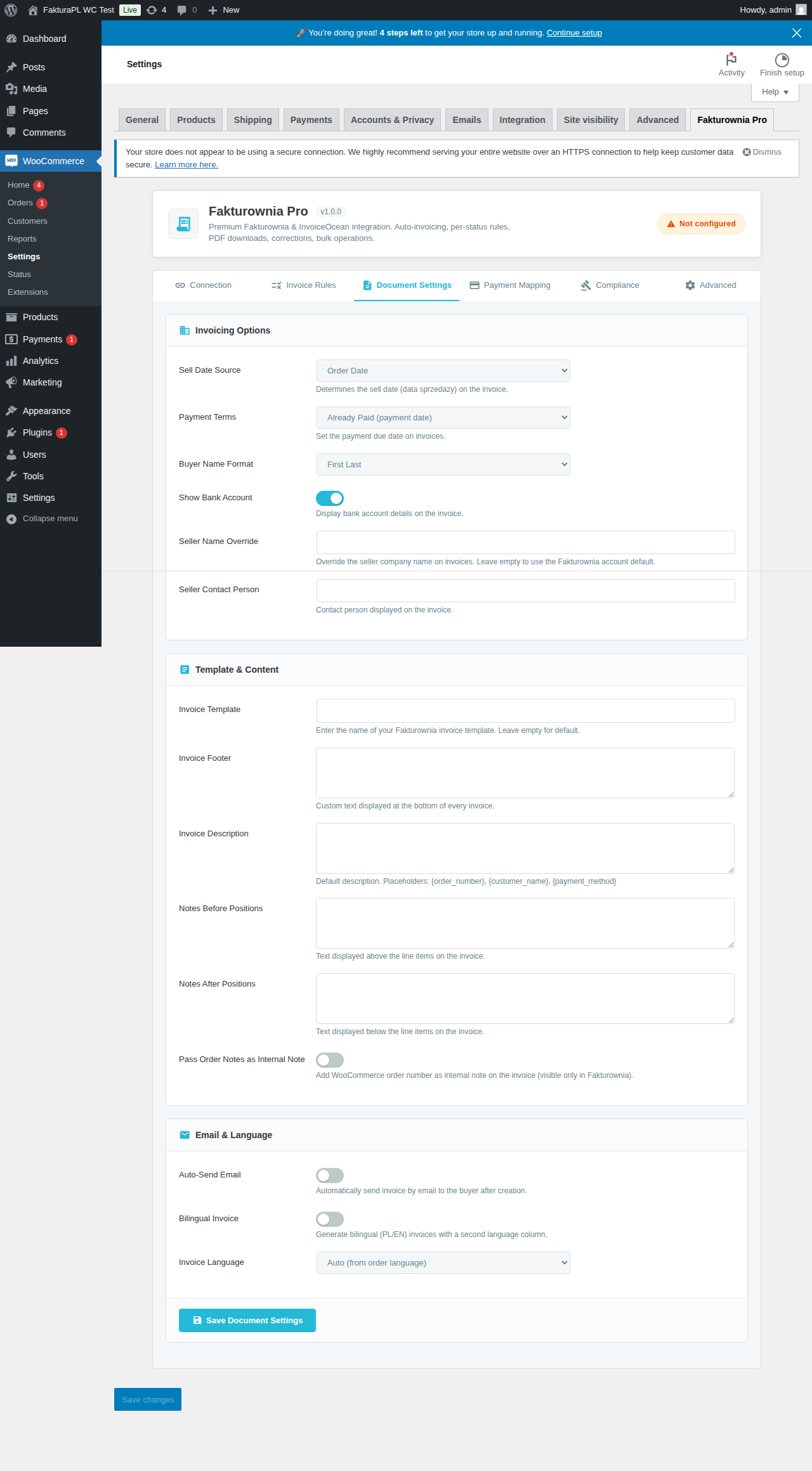 Document Settings control how every invoice generated by Fakturownia for WooCommerce looks and what information it contains. Most stores configure these once at setup and never touch them again. This page covers every option in detail so you configure it correctly the first time.