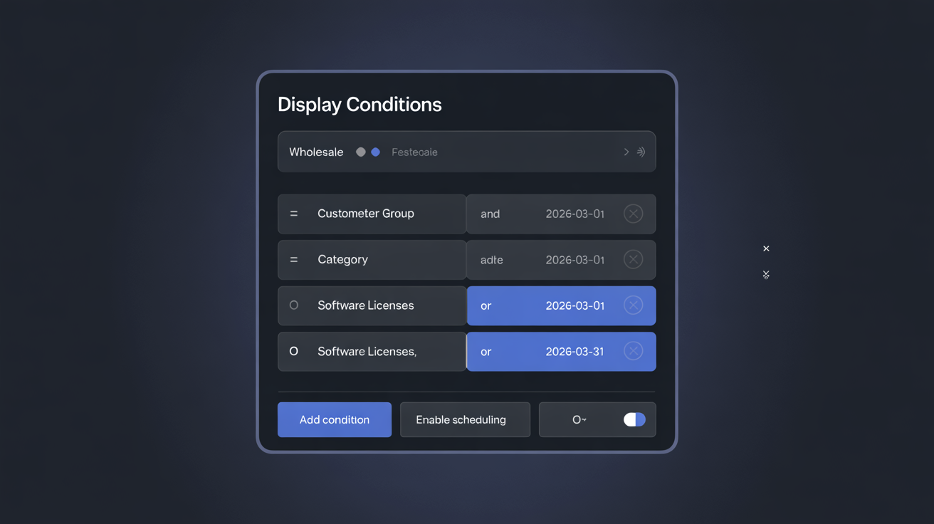 A block on displayProductAdditionalInfo with conditions "Category = Software" AND "Customer Group = Wholesale" shows: "Volume licensing available โ [contact us] for orders of 10+ seats." Appears only to wholesale customers on software product pages.