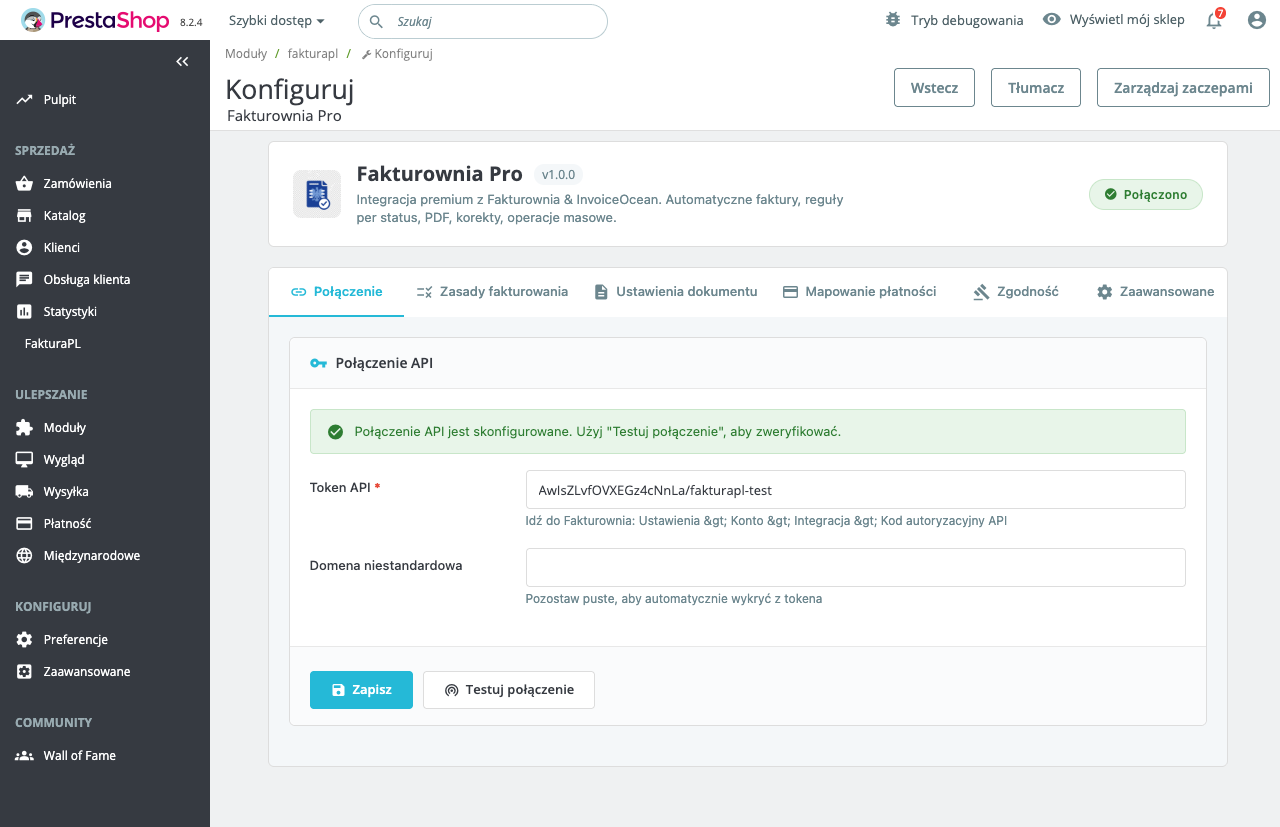 | Indicator | Meaning | |---|---| | Green "Connection verified" | Token valid, NIP matches, environment reachable | | Red "Token invalid (10000)" | Token revoked or NIP not registered in this environment | | Red "NIP mismatch (20100)" | Seller NIP in config does not match NIP on token | | Red "Connection failed" | Server cannot reach KSeF API โ€” check firewall |