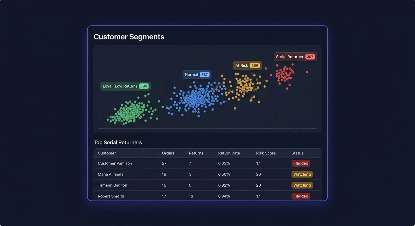 | Segment | Return rate definition | Description | |---|---|---| | Champions | Under 5% (or under 0.5x store average) | Loyal buyers who almost never return. Your highest-LTV customers. | | Standard | 5โ20% (or 0.5xโ2x store average) | Typical customers within normal return behavior range. | | At Risk | 20โ40% (or 2xโ4x store average) | Return rate rising or already elevated. Often has a fixable root cause. | | Serial Returners | Over 40% (or over 4x store average) | Habitual returners โ may be wear-and-return, size bracketing, or return fraud. |